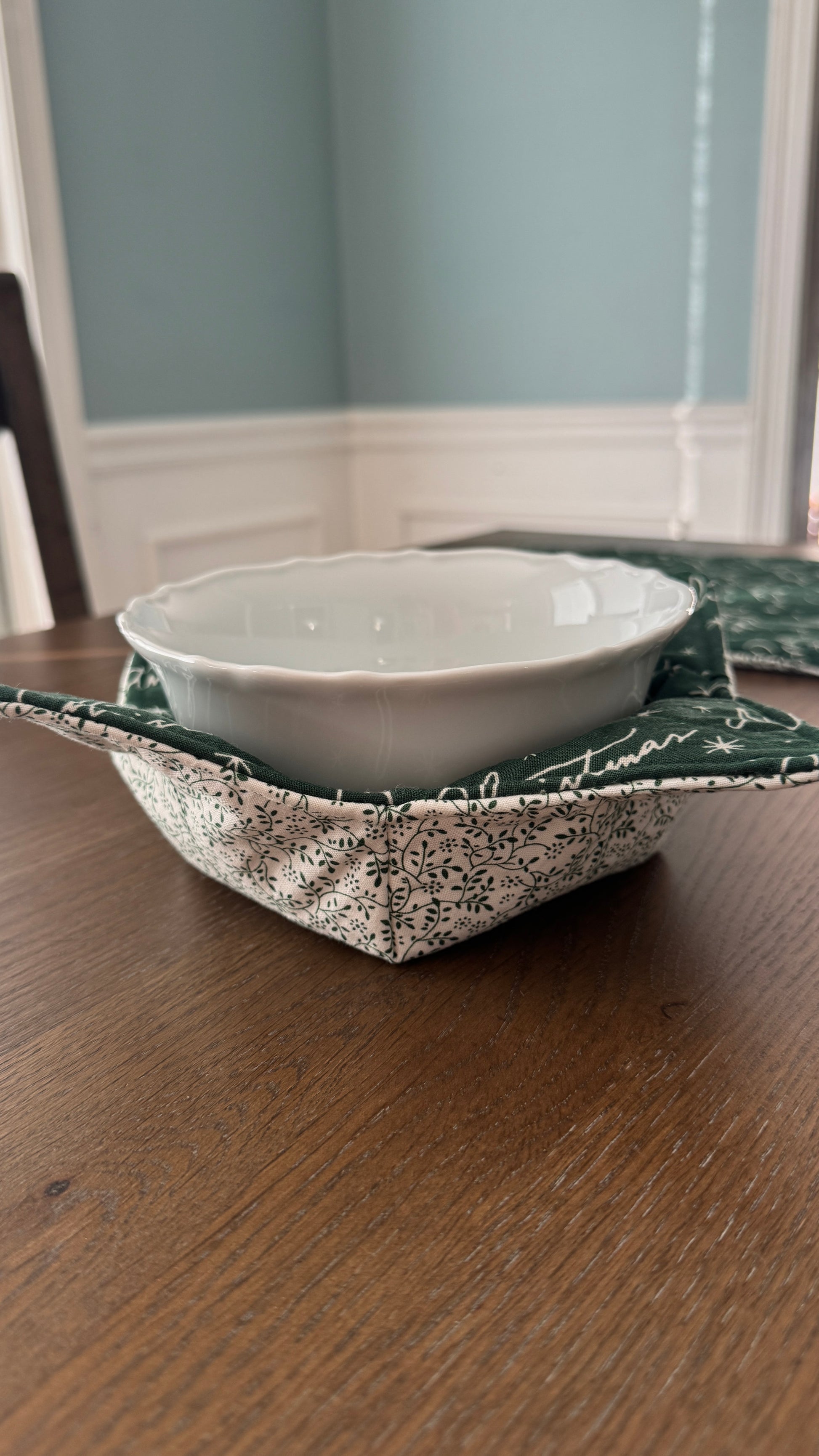 Lined with heat resistant material, these handmade cotton fabric and cotton thread reversible bowl koozies will provide a barrier between you and your hot or cold bowl. Great for soups, hot or cold breakfasts, chili, ice cream and more!