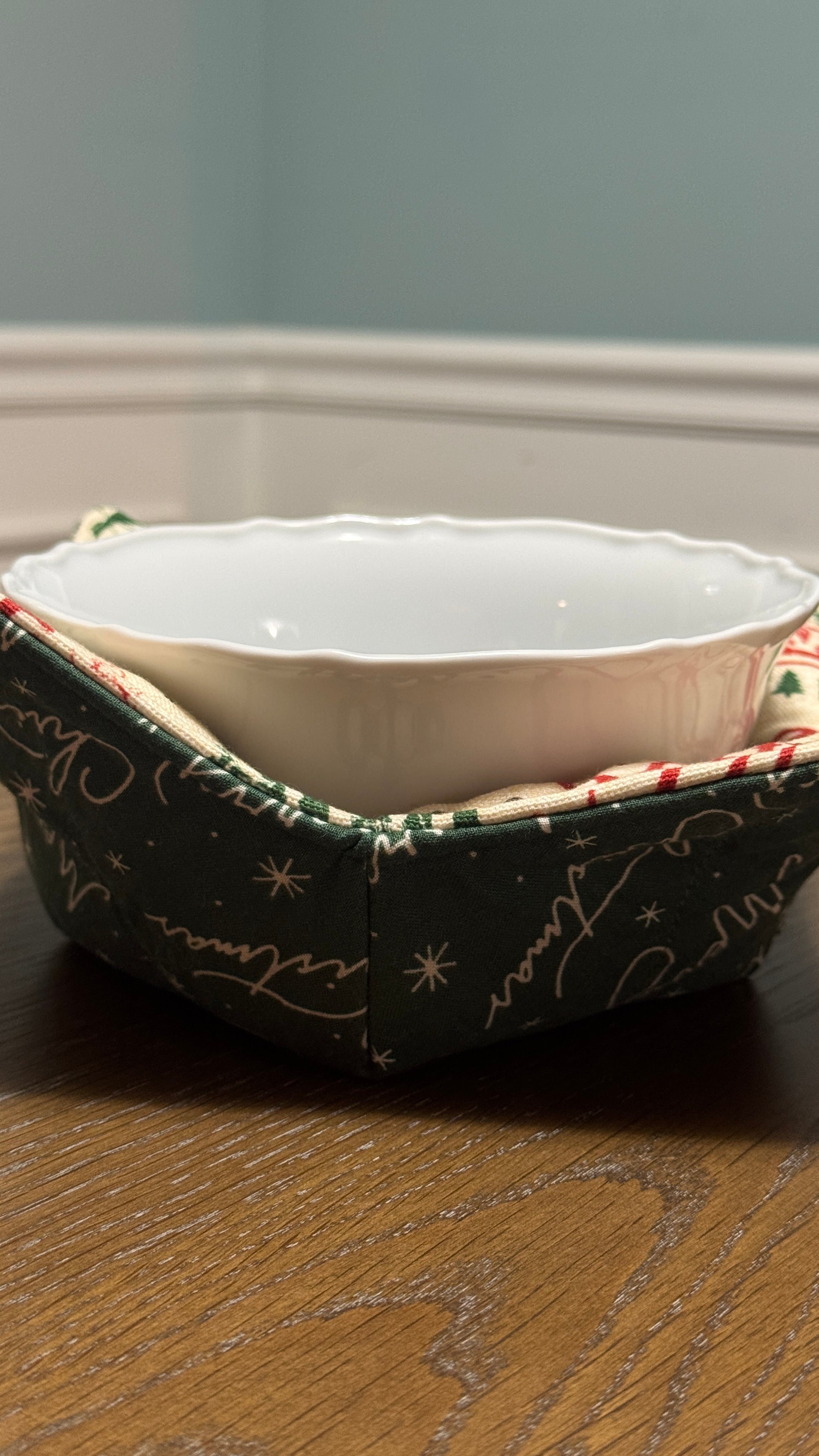 Lined with heat resistant material, these handmade cotton fabric and cotton thread reversible bowl koozies will provide a barrier between you and your hot or cold bowl. Great for soups, hot or cold breakfasts, chili, ice cream and more!